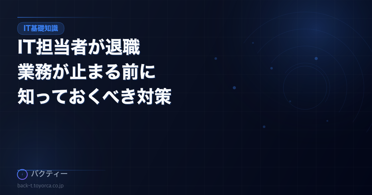 中小企業のIT担当者は「なんとなく詳しい人が兼任」というケースがほとんどです。その方が退職したとき、会社のIT基盤が一夜にして崩壊する——そのリスクは今日からでも対処できます。